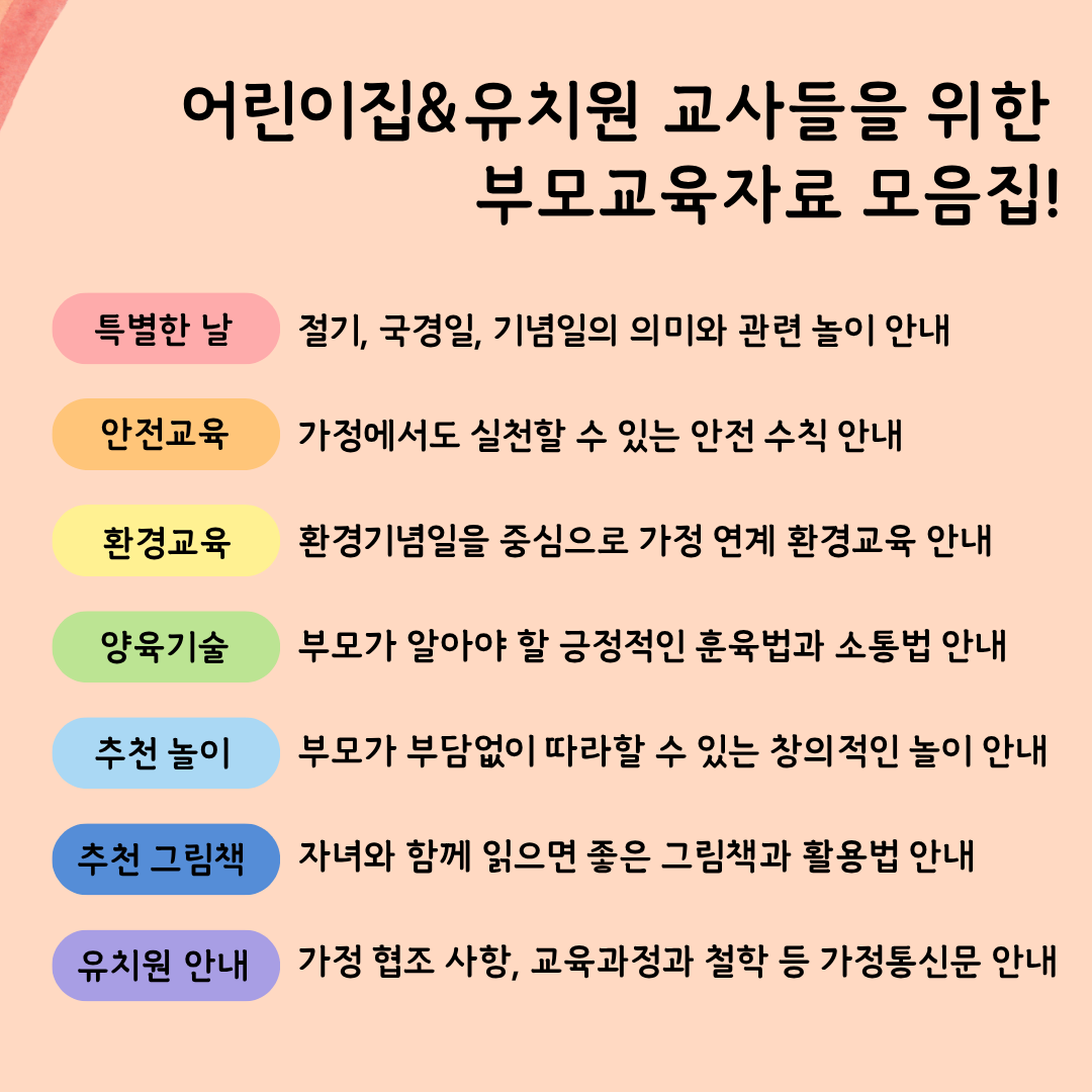 어린이집과 유치원에서 부모교육용 가정통신문으로 활용할 수 있는 전자책입니다.