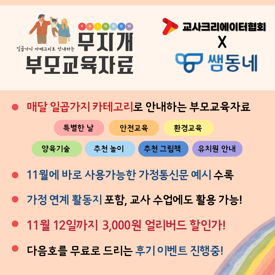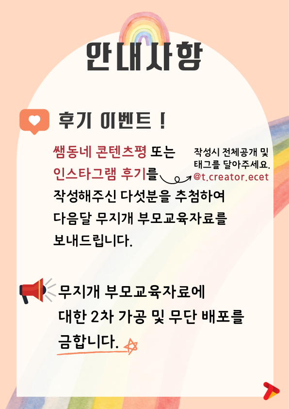 인스타그램(작성시 전체공개 및 태그입력 @t.creator.ecet) 또는 쌤동네 콘텐츠평을 써주시면 추첨을 통해 다음 호를 무료로 보내드리는 이벤트도 진행중입니다. 많은 참여 부탁드리며, 현장에서 유용하게 활용해보시기 바랍니다.