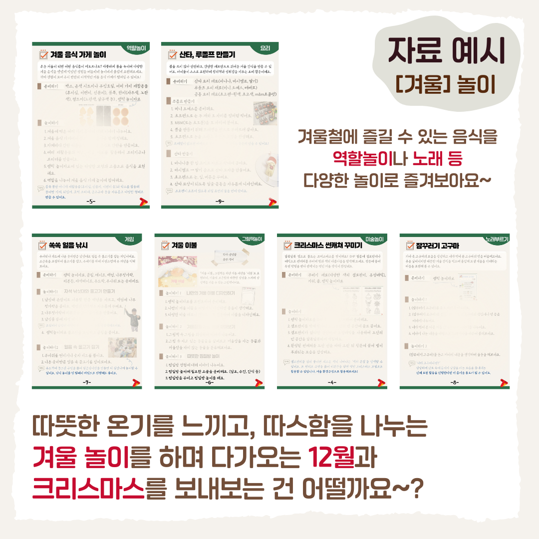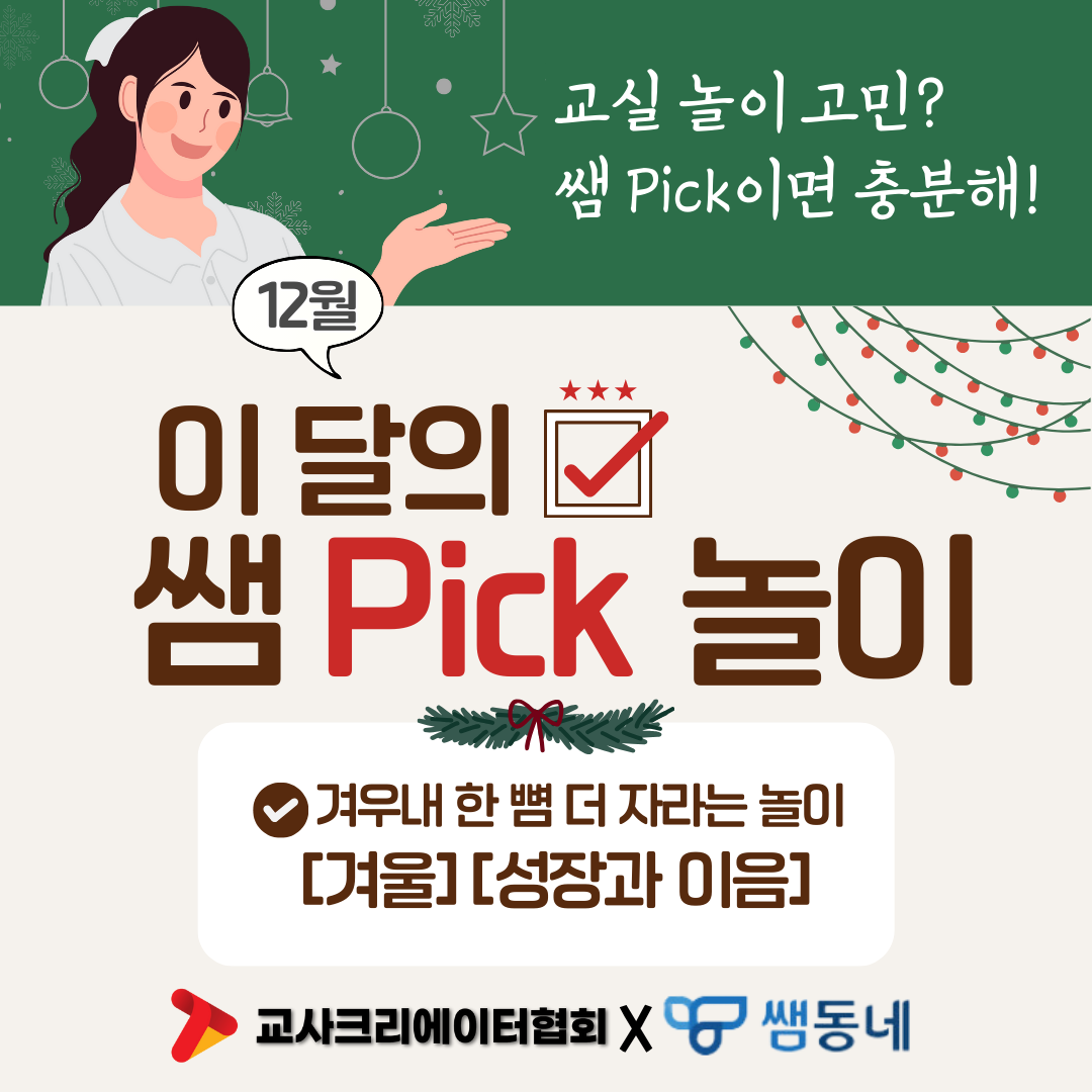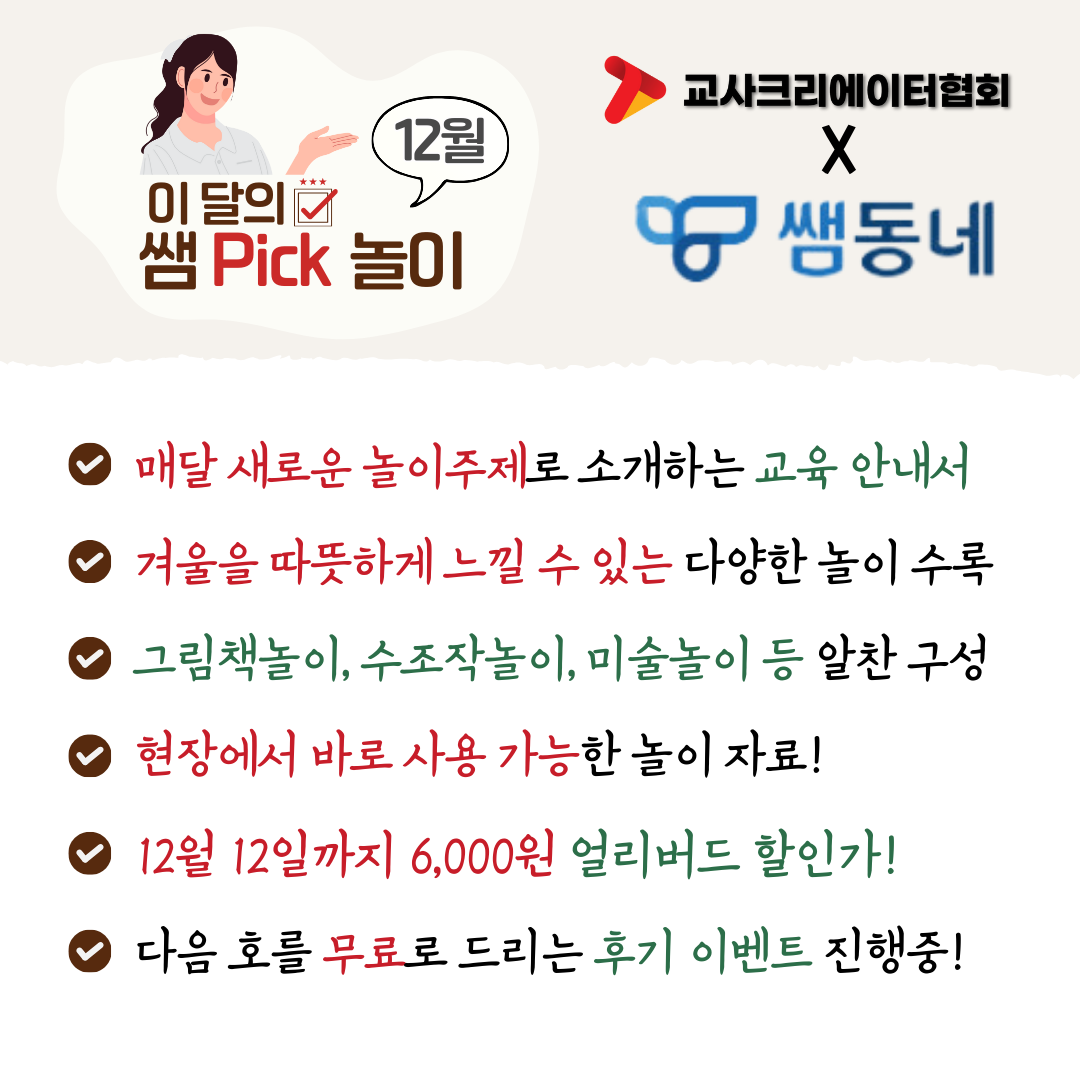 12월의 겨우내 한 뼘 더 자라는 놀이 '겨울'과 '성장과 이음' 놀이자료가 담겨있습니다. 쌤픽놀이는 어린이집과 유치원, 초등 저학년까지 활용 가능합니다. 인스타그램(작성시 전체공개 및 태그입력 @t.creator.ecet) 또는 쌤동네 콘텐츠평을 써주시면 추첨을 통해 다음 호를 무료로 보내드리는 이벤트도 진행중입니다. 많은 참여 부탁드리며, 현장에서 유용하게 활용해보시기 바랍니다.