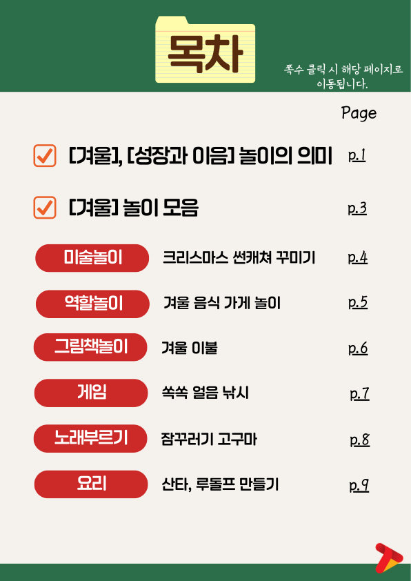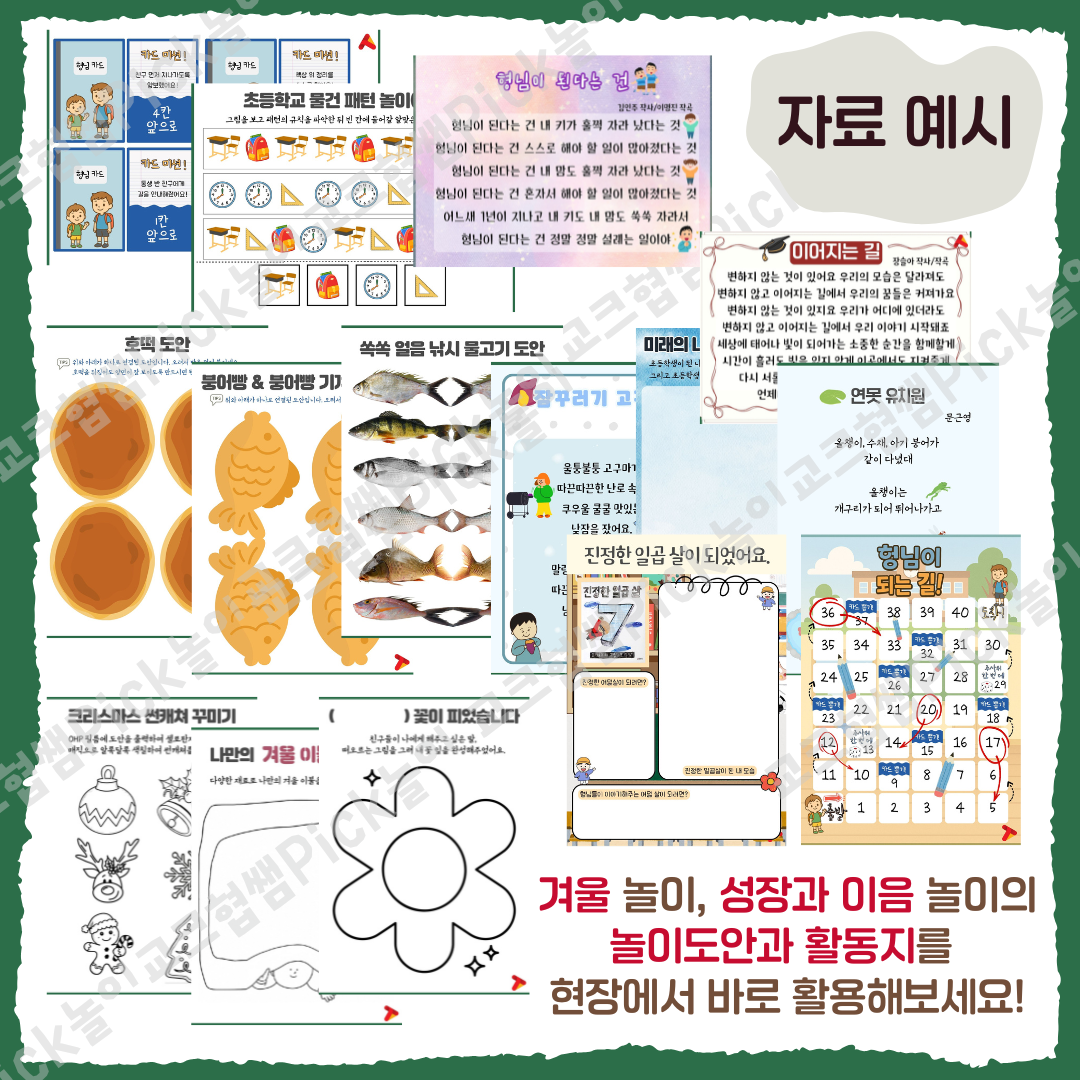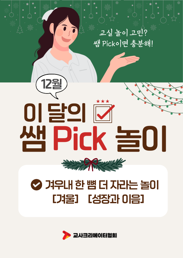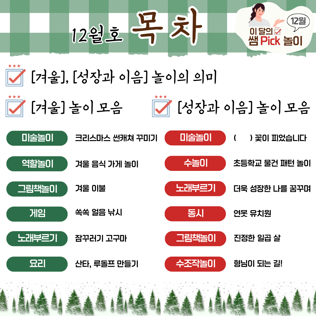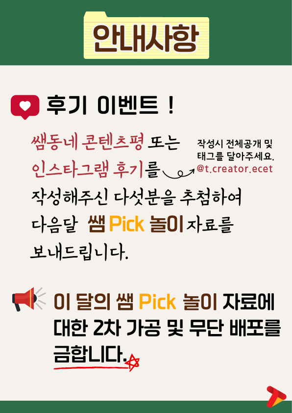 12월의 겨우내 한 뼘 더 자라는 놀이 '겨울'과 '성장과 이음' 놀이자료가 담겨있습니다. 쌤픽놀이는 어린이집과 유치원, 초등 저학년까지 활용 가능합니다. 인스타그램(작성시 전체공개 및 태그입력 @t.creator.ecet) 또는 쌤동네 콘텐츠평을 써주시면 추첨을 통해 다음 호를 무료로 보내드리는 이벤트도 진행중입니다. 많은 참여 부탁드리며, 현장에서 유용하게 활용해보시기 바랍니다.
