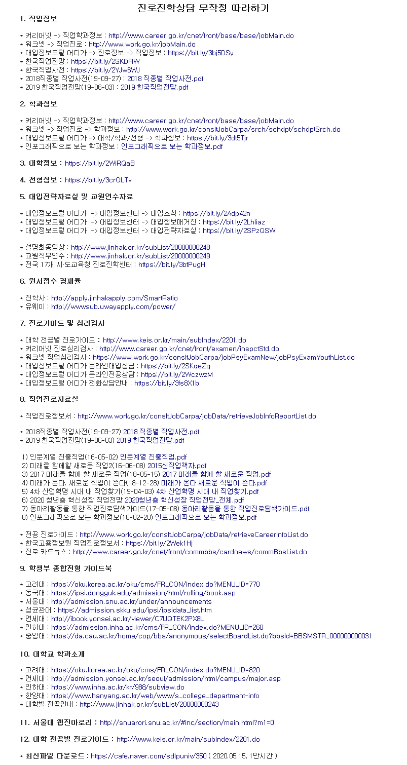 학생 상담할 때 활용할 수 있는 자료와 사이트를 한 화면에 정리했습니다.