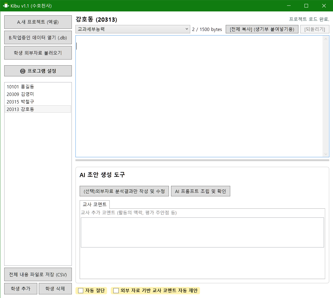 엑셀 명렬표, 보고서, 활동 사진만 넣으면 교과세특·자율·행발 초안을 한 번에 만들어 주는 교사용 AI 생기부 도우미입니다. 코딩 지식 없이도 ‘현재 학생’부터 ‘반 전체’까지 버튼 한 번으로 작성하고, 글자 수 조정과 문장 다듬기까지 한 번에 해결할 수 있습니다.